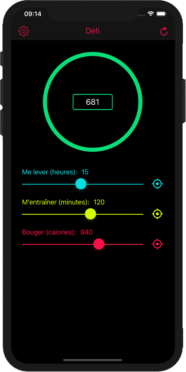 Lorsque vous ouvrez l’application Défi, vos points actuels s’affichent dans la partie supérieure de l’écran. Les glisseurs me lever, m'entraîner et bouger se trouvent en-dessous.